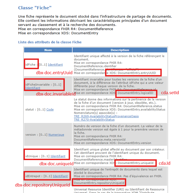 Nous essayons autant que se peut de suivre le MOS : https://mos.esante.gouv.fr et le mapping des données XDS CDA définis ici : https://esante.gouv.fr/annexe-lien-entre-len-tete-cda-et-les-metadonnees-xds , tout en gardant une compatibilite ascendante au maximum.