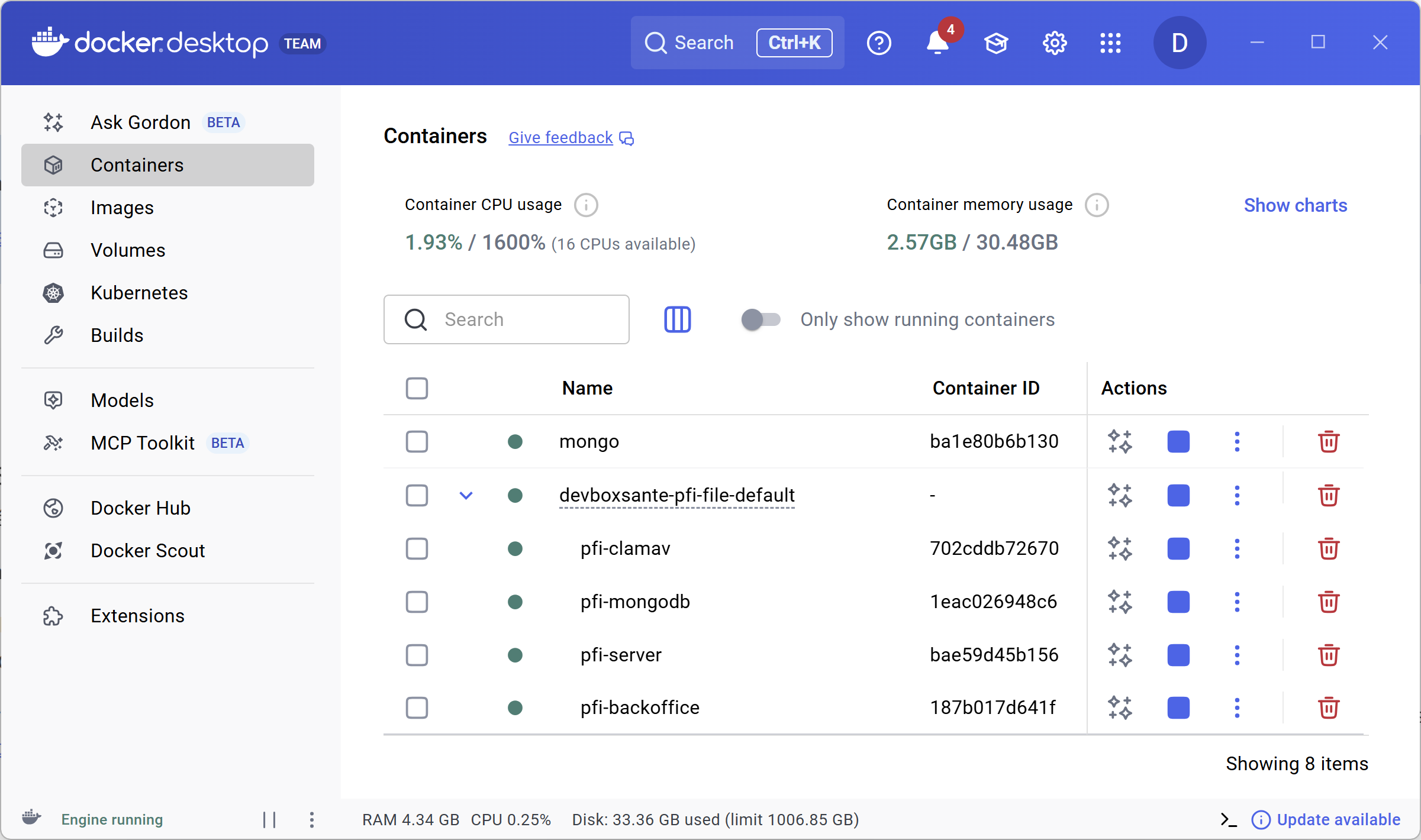 Et si on ouvre Docker Desktop on retrouve regroupés au sein d’un nouveau groupe (“stack”) nos 4 containers qui tournent :